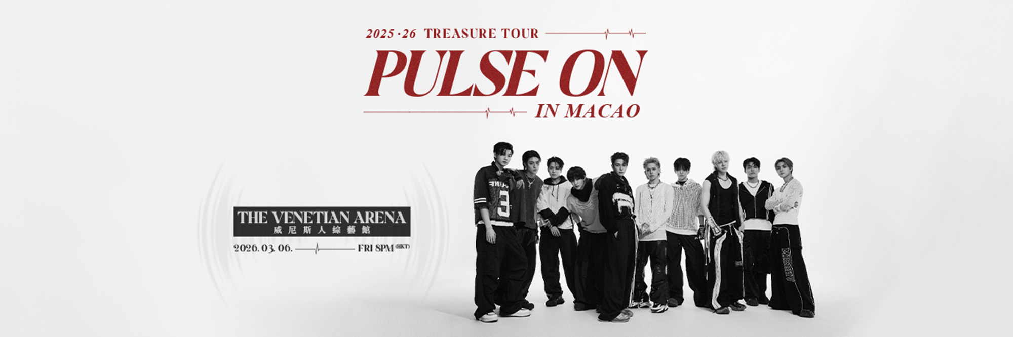 2025-26 TREASURE TOUR [PULSE ON] IN MACAO 將於 2026 年 3 月 6日(星期五)在威尼斯人綜藝館舉行。YG娛樂旗下男子團體TREASURE由CHOI HYUN SUK, JIHOON, YOSHI, JUNKYU, YOON JAE HYUK, ASAHI, DOYOUNG, HARUTO, PARK JEONG WOO及SO JUNG HWAN組成。自2020年8月以出道曲〈BOY〉正式出道以來,TREASURE以驚人速度得到全球關注,並迅速獲得「怪物新人」的稱號。